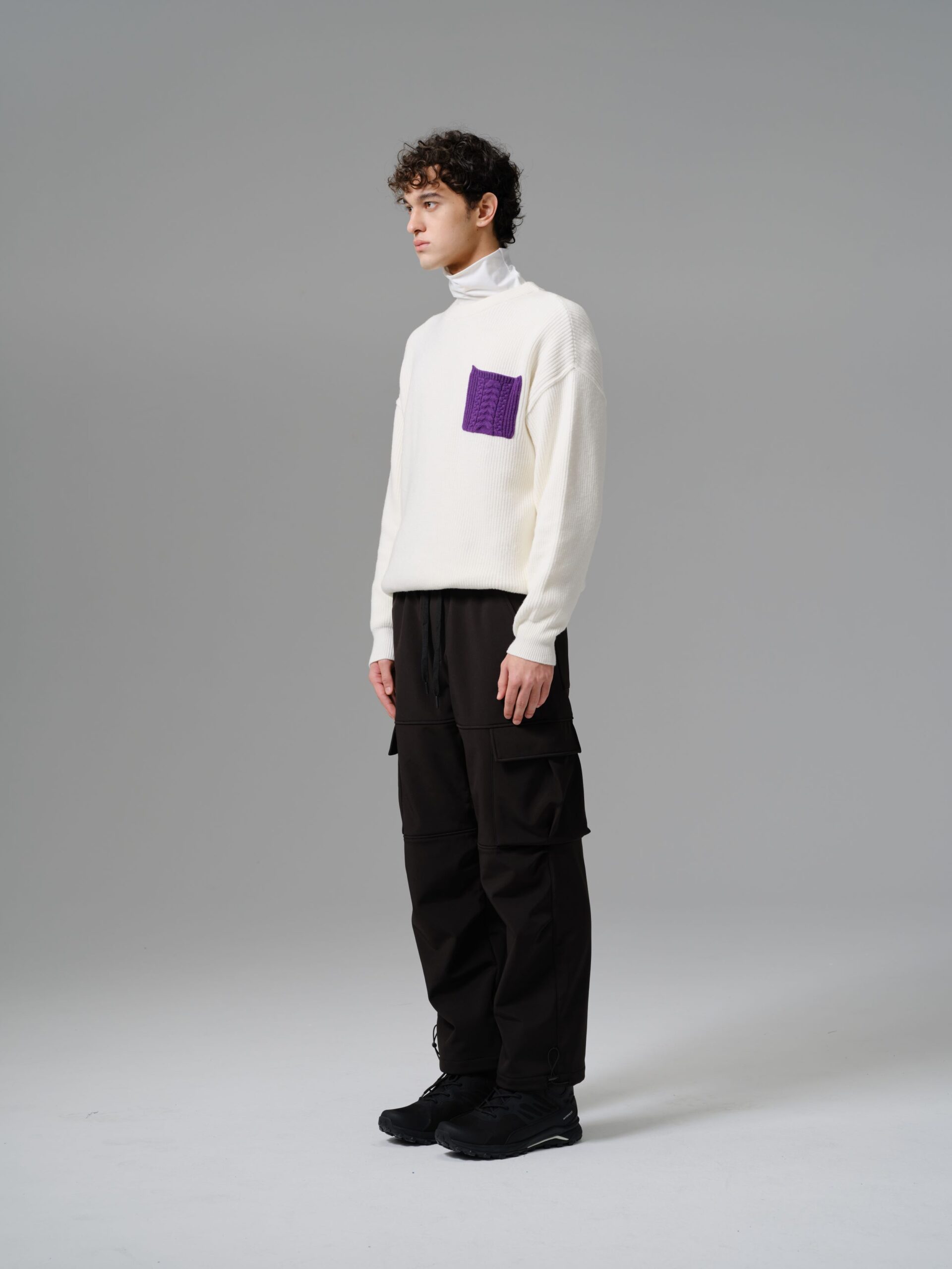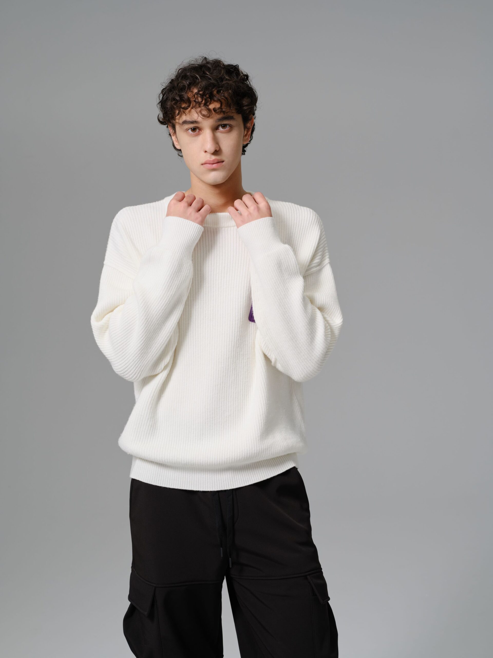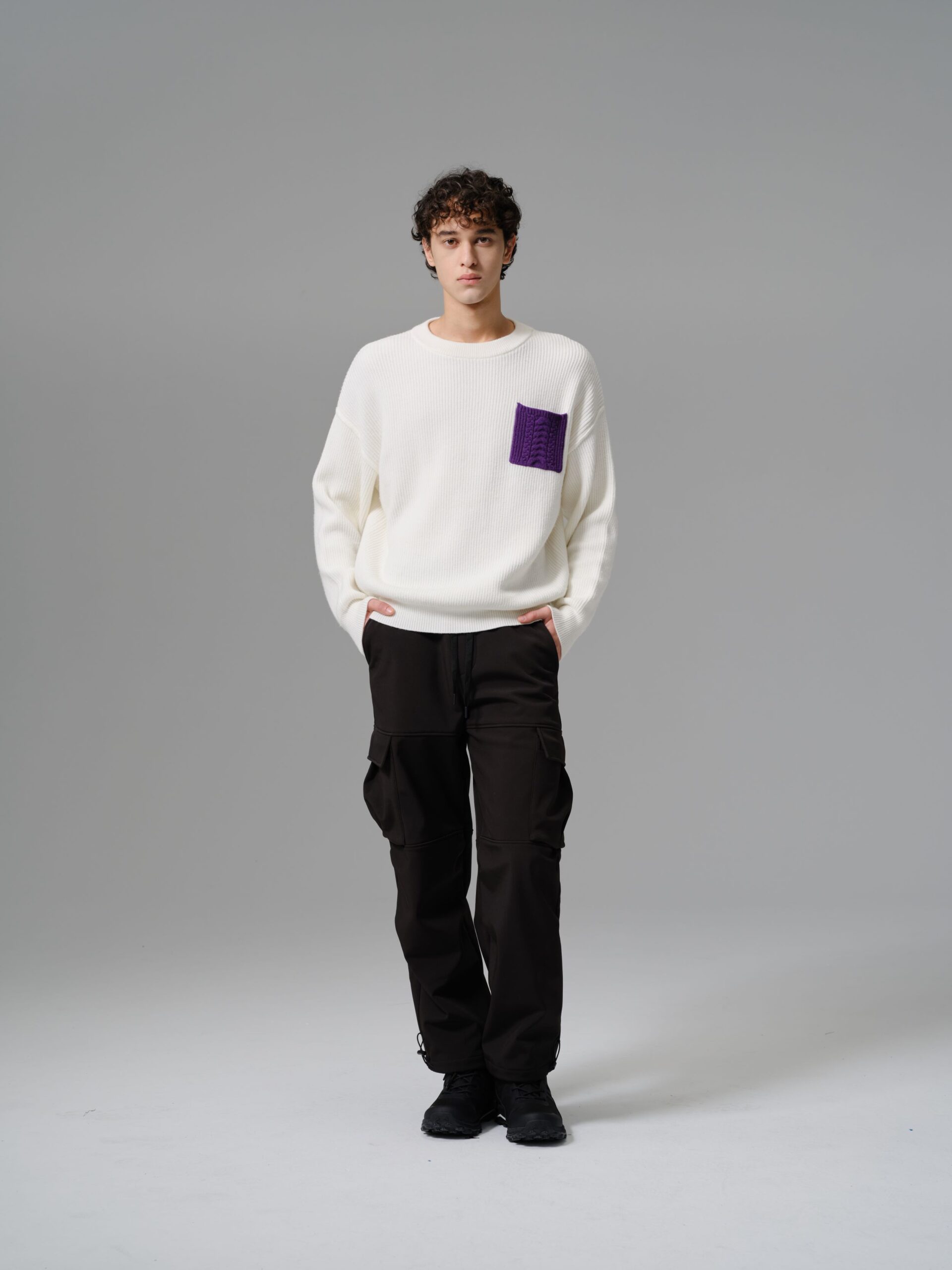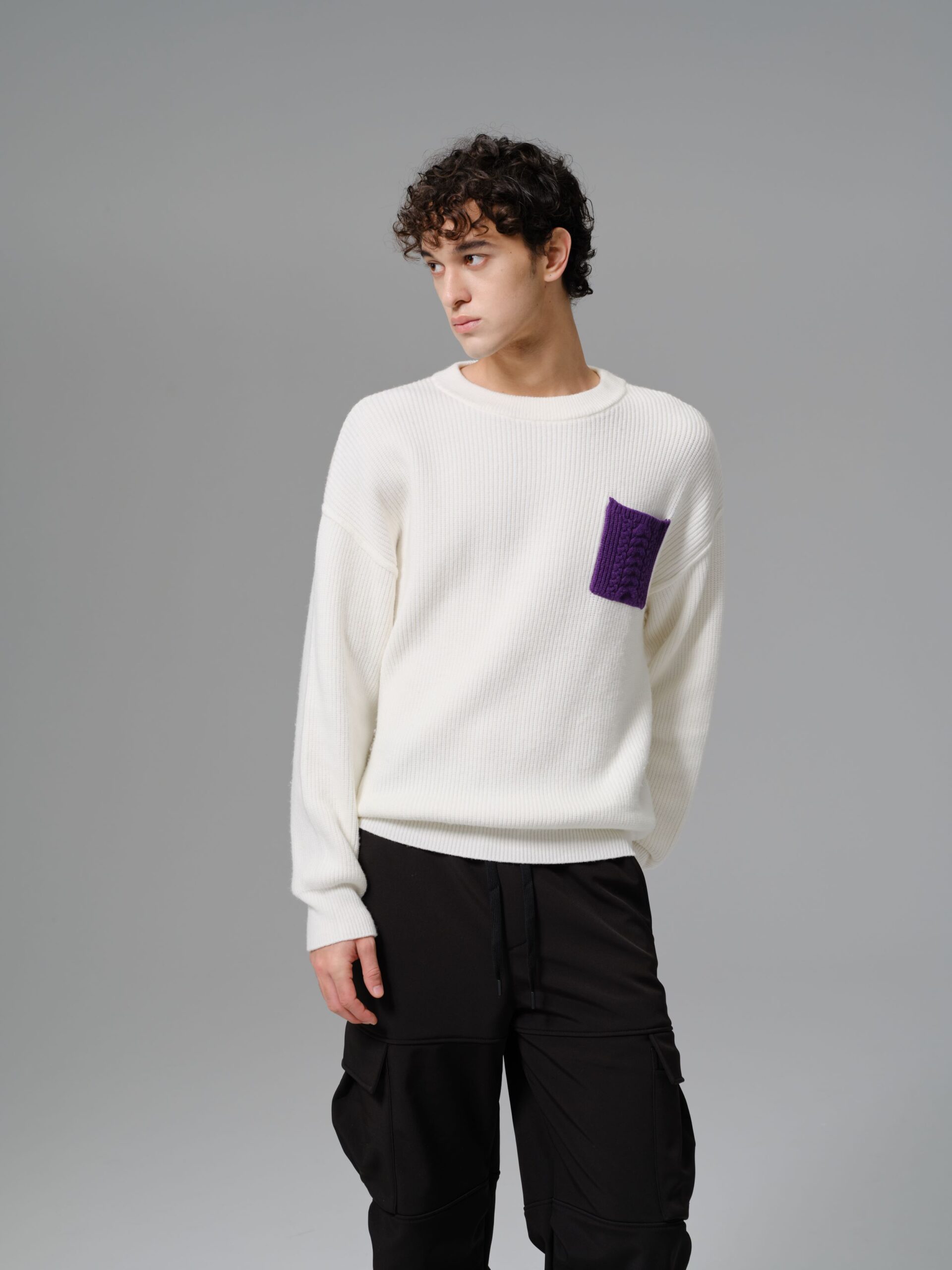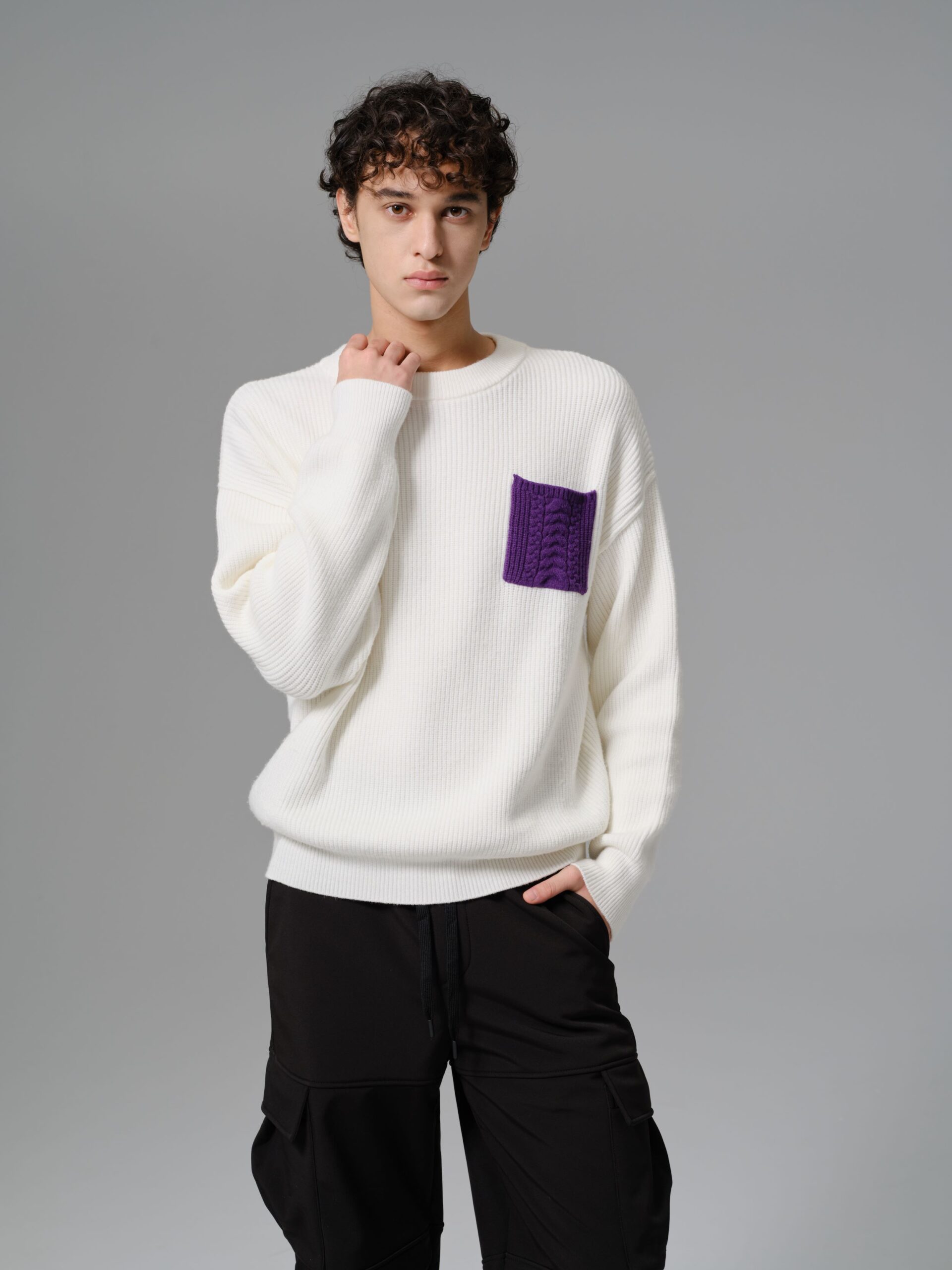 Sale! Elevate your casual wardrobe with this modern wool-mix sweater designed for comfort and subtle statement style. Crafted from a soft and warm wool blend fabric, it offers a relaxed fit with ribbed texture throughout for a refined yet effortless look. The standout feature is the bold purple cable-knit pocket on the chest, adding a touch of contrast and personality to the clean white base.